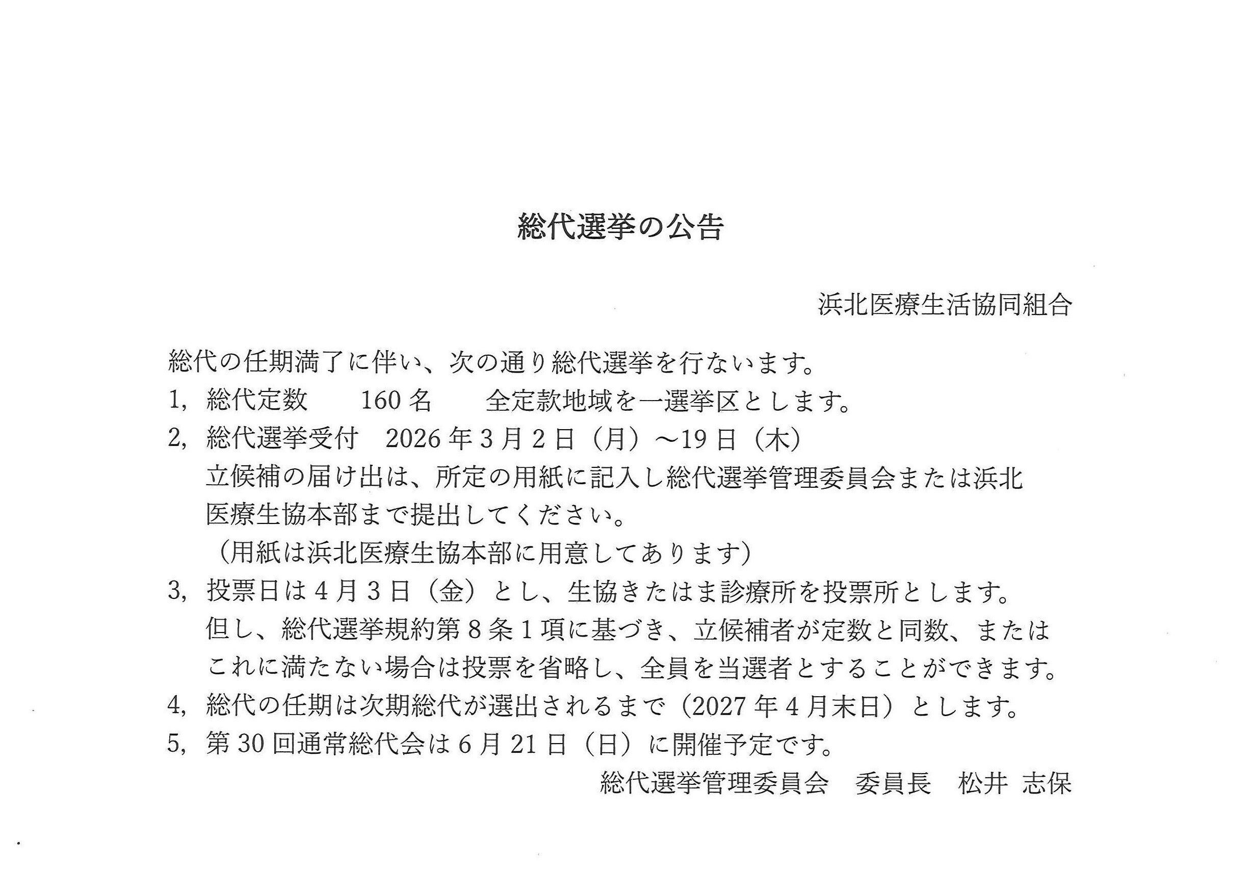 浜北医療生協 総代選挙の公告